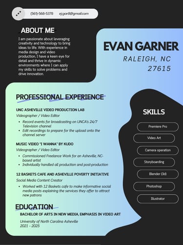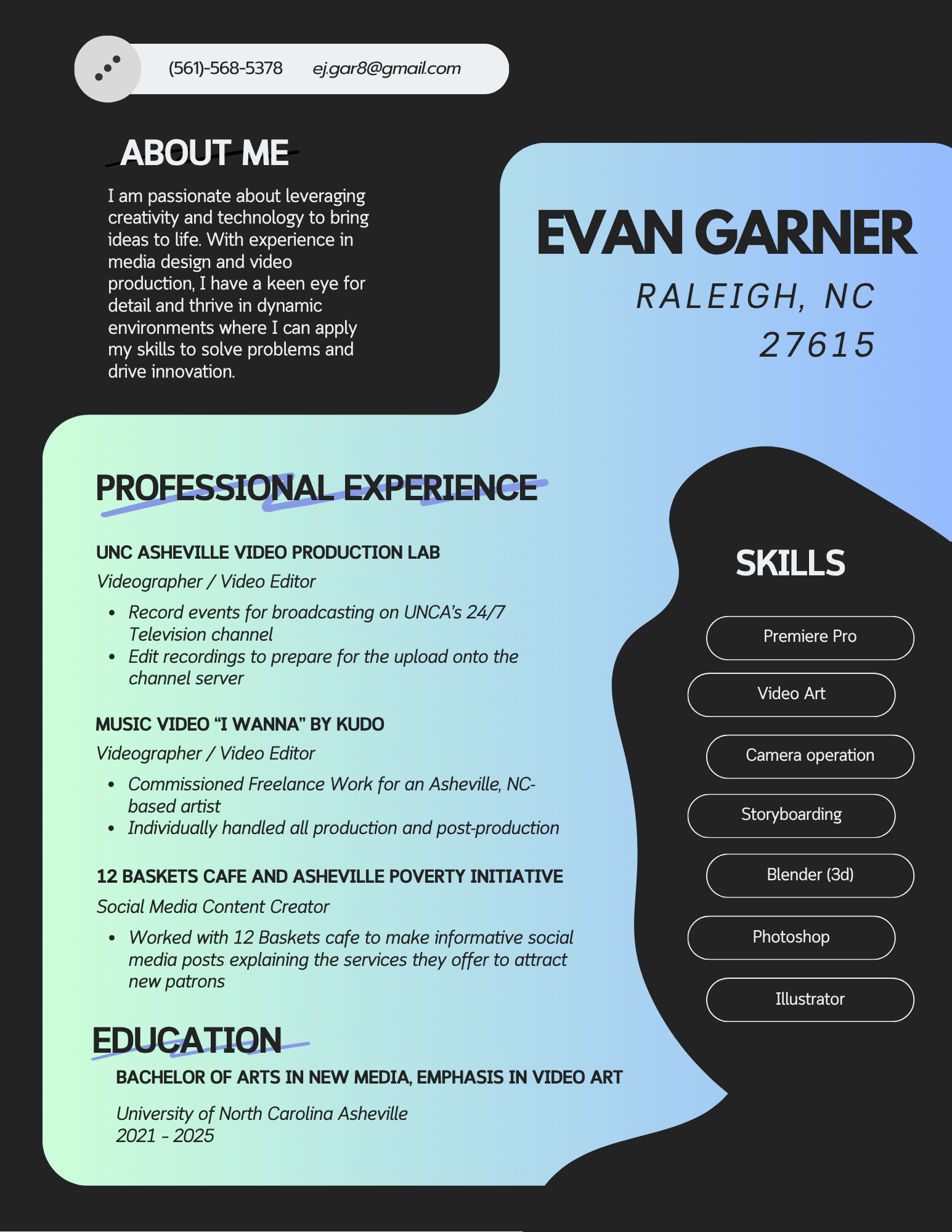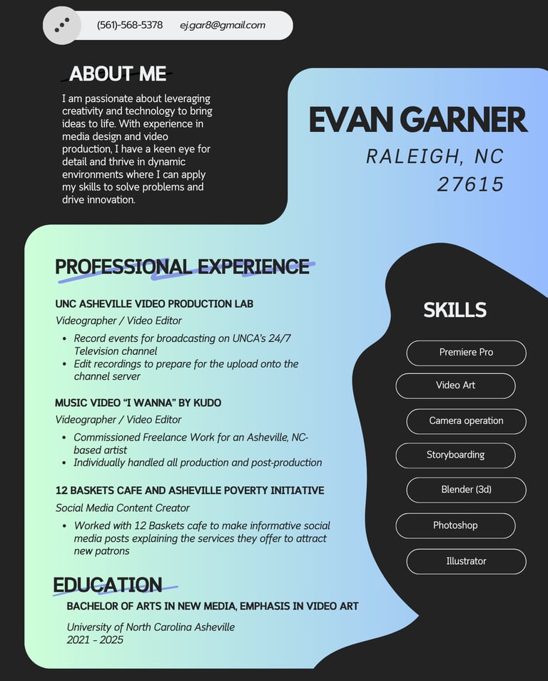 I have been commissioned to create music videos and have worked as a videographer/video editor in the UNC Asheville Video Production Lab. I am proficient in the Adobe Creative Suite and have a strong creative passion for problem-solving.